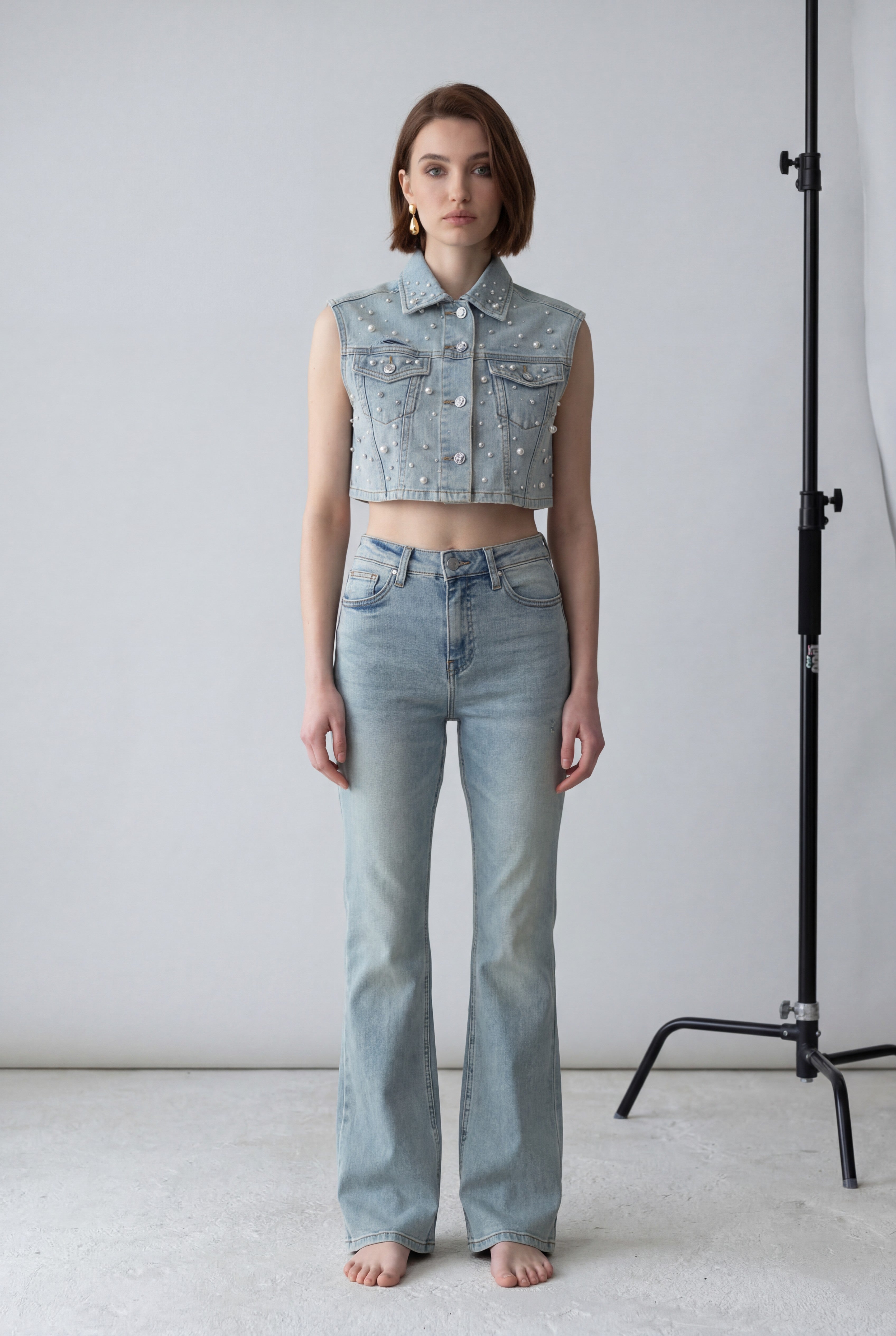 Un capo statement che trasforma qualsiasi outfit. Questo gilet crop in denim chiaro è arricchito da applicazioni luminose che donano un effetto brillante e contemporaneo.